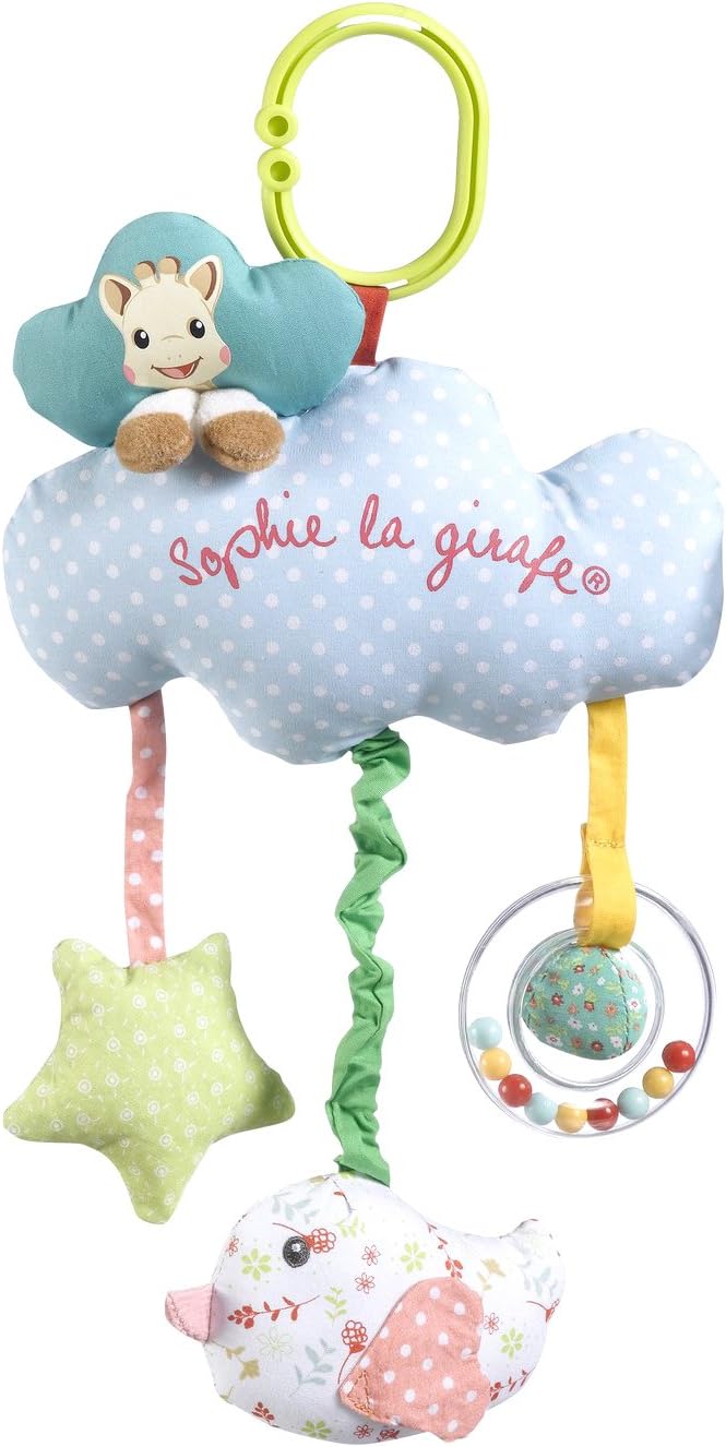 Une boîte à musique toute douce en forme de nuage pour inviter bébé au sommeil. Une douce mélodie à découvrir lorsqu'on tire sur kiwi l'oiseau. Une étoile et une balle dans son anneau à découvrir pour attirer le regard de bébé. Se fixe facielemnt à tous supports à l'aide de son crochet en plastique.
